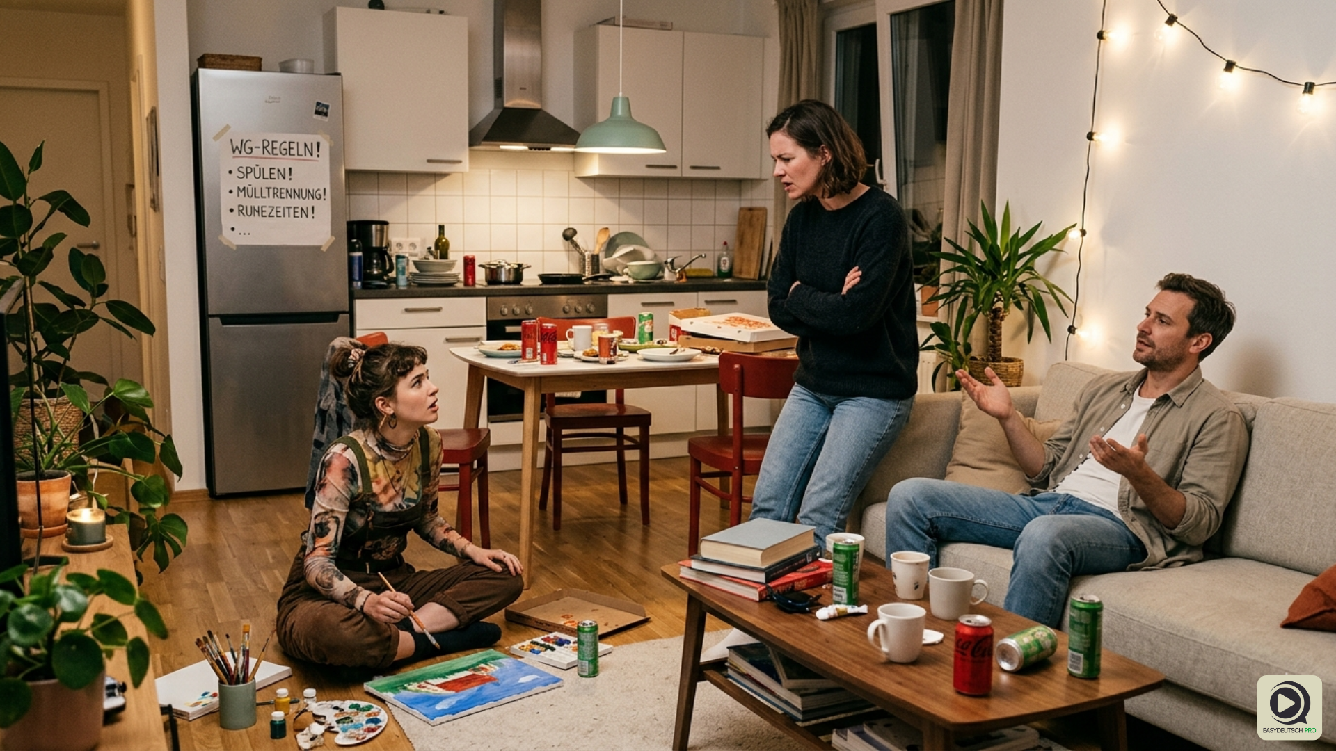Die Situation spitzte sich zu, als Sofia eines Tages beschloss, den halben Wohnungsflur in eine improvisierte Werkstatt zu verwandeln. Ihre Leinwände, Farben und Pinsel lagen kreuz und quer herum und erschwerten das Durchkommen. Mia, die gerade auf dem Weg zur Arbeit war und es eilig hatte, trat beinahe auf eine Tube Farbe. Es war der Tropfen, der das Fass zum Überlaufen brachte. Am Abend, als alle drei zu Hause waren, stellte Mia ein Ultimatum. „Wir müssen reden“, sagte sie mit fester Stimme. „Das geht so nicht weiter. Wir brauchen klare Regeln, an die sich jeder hält, sonst funktioniert das nicht. Es ist keine Unhöflichkeit, die WG-Regeln zu beachten, sondern schlichtweg die Basis unseres Zusammenlebens. Wir haben alle unterschiedliche Tagesabläufe und Bedürfnisse. Sofia, dein Chaos stört unsere Abläufe und unsere Sauberkeit. Leon, dein Wegschauen hilft nicht. Ich bin nicht die Mutter, die ständig aufräumen muss.“ Leon und Sofia schwiegen. Die bisherige Harmonie drohte zu zerbrechen.