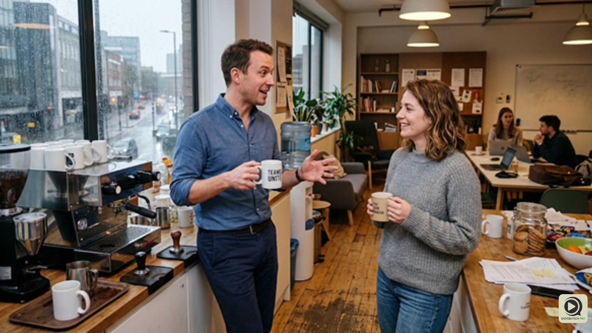Szenario: Markus und Julia sind Kollegen in einer Marketing-Agentur. Sie treffen sich nach einer Woche im Homeoffice im Büro an der Kaffeemaschine und tauschen sich über ihre Erfahrungen aus.