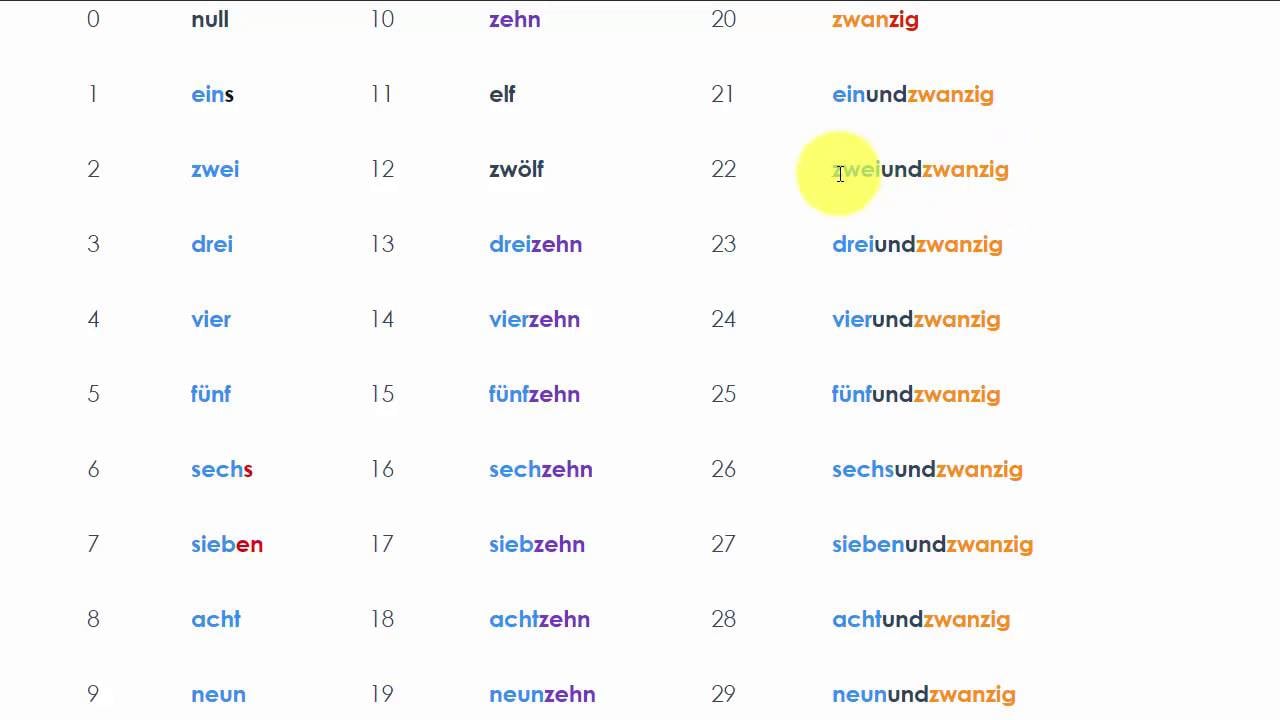 2 | zwei | 12 | zwölf | 22 | zweiundzwanzig |